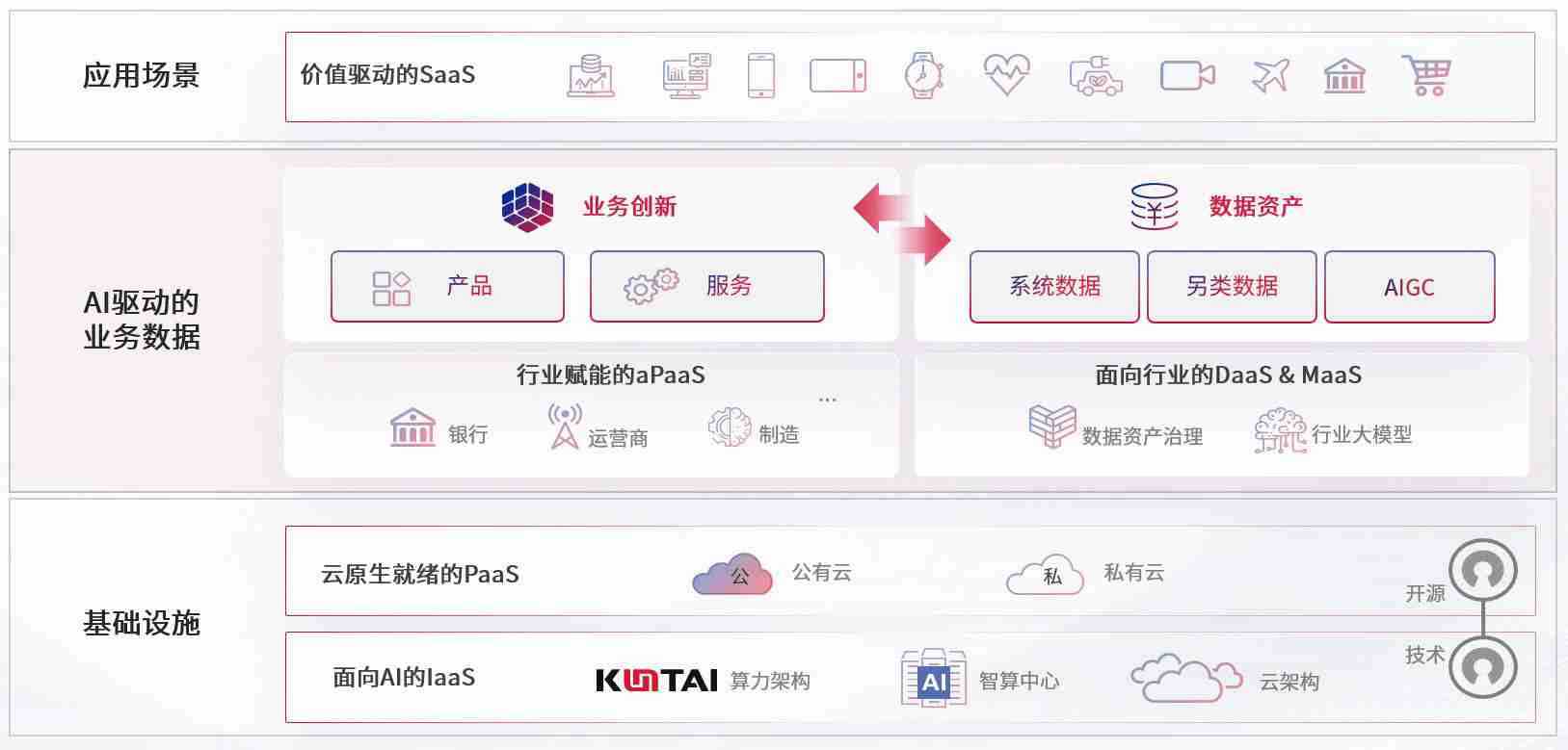 数字时代,,,围绕企业数字化转型的关键要素,,Z6尊龙数码开创性的提出数云融合战略和技术体系框架,,,,着力在云原生、、、、数字原生、、、、AI原生和信创产业上架构产品和服务能力,,为处在不同数字化转型阶段的快消零售、、、汽车、、、、金融、、医疗、、、政企、、教育、、、运营商等行业客户提供泛在的敏捷IT能力和融合的数据驱动能力,,构建跨界融合创新的数字业务场景和新业务模式,,助力企业级客户建立面向未来的核心能力和竞争优势,,全面推动社会的数字化、、智能化转型升级。。。
